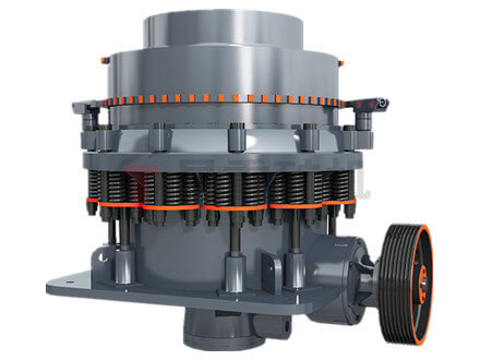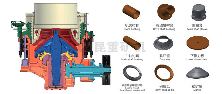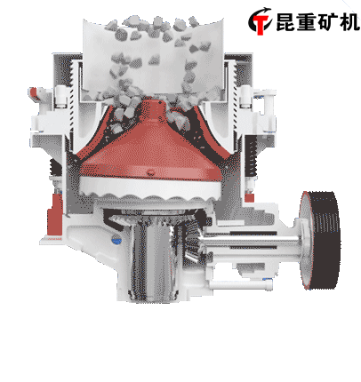 在弹簧液压圆锥破碎机的工作过程中,电动机通过传动装置带动偏心套旋转,动锥在偏心轴套的迫动下做旋转摆动,动锥靠近静锥的区段即成为破碎腔,物料受到动锥和静锥的多次挤压和撞击而破碎。动锥离开该区段时,该处已破碎至要求粒度的物料在自身重力作用下下落,从锥底排出。