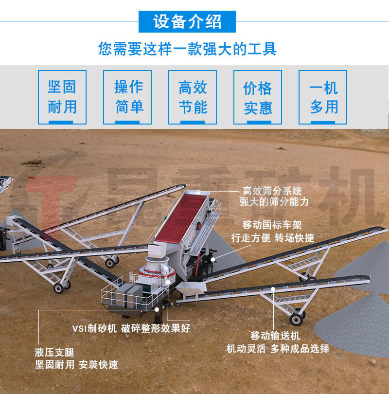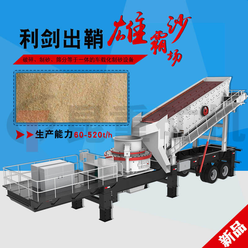 移动式制砂机具有强劲的可移动性,可深入破碎现场,进行矿石物料的制砂处理,不仅打破了生产条件、制砂环境对制砂生产设备的局限,省却物料搬运环节,简化制砂流程,为用户节省了可观的运输费用等等。