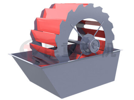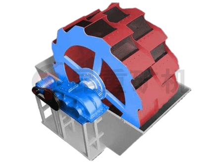 轮式洗砂机工作时,电机通过三角带、减速机、齿轮减速后带动叶轮缓慢转动,砂石有给料槽进入洗槽中,在叶轮的带动下翻转、搅拌、淘洗,并互相研磨,除去覆盖砂石表面的杂质,同时破坏包覆砂粒的水汽层,以利于脱水;同时加水,形成强大水流,及时将杂质及比重小的异物带走,并从溢出口洗槽排出,完成清洗作用。干净的砂石由叶片带走,砂石从旋转的叶轮倒入出料槽,完成砂石的清洗作业。
