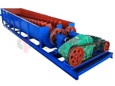 双轴洗石机的给料是从槽体的下端给入,粘结在一起的砂石泥团被洗矿叶片连续的搅拌、擦洗,并受到上端高压冲洗水的冲洗和松散作用,迫使粘性泥土与物料颗粒解离,黏士形成悬浮状态的矿浆由下部溢流槽排出,粗粒物料颗粒则受到叶片的推动作用,从洗石机上部的排料口排出。