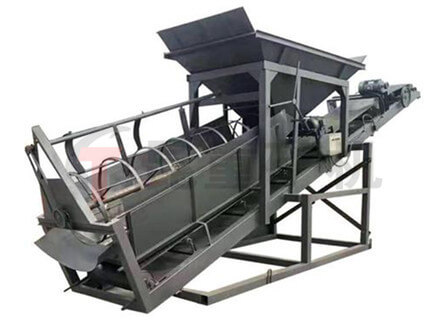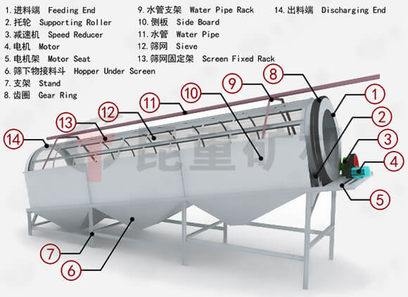 滚筒筛主要有电机、减速机、滚筒装置、机架、密封盖、进出料口组成。筒体一般分三段,可视具体情况而定,筛孔由小到大排列,每一段上的筛孔孔径相同。为了提高筛分效率,物料在滚筒筛内移动的速度不能太快,否则将造成筛分不充分、不彻底,因此滚筒筛一般都有严格规定的安装倾角,通常来说角度为5°,在实际情况下,可根据需要进行调整。滚筒段是通过螺母、螺钉与滚筒筛转盘相连接的,因此滚筒段的安装与拆卸比较方便。由于滚筒段与转盘相连,当转盘在驱动装置的驱动下发生转动时,滚筒段也跟着一起转动。